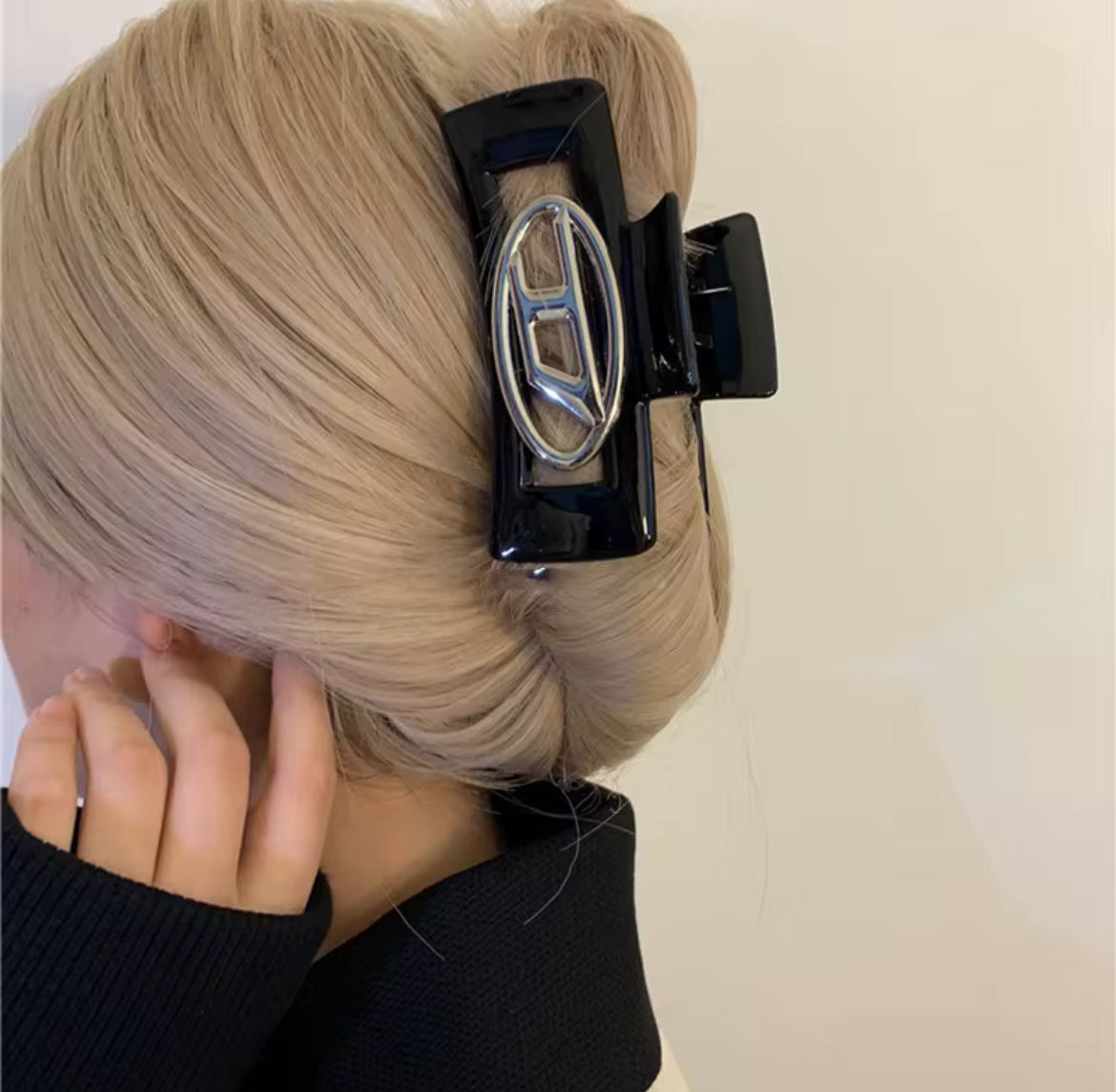 Elevate your everyday hair game with this statement black hair clip, measuring 13 cm for a secure and comfortable hold. Crafted with a glossy finish and modern edge, it features a bold metallic logo detail that adds a touch of luxury to any look. Perfect for sweeping back thick strands or finishing off a chic updo, this versatile accessory blends practicality with unmistakable style.